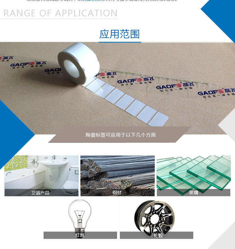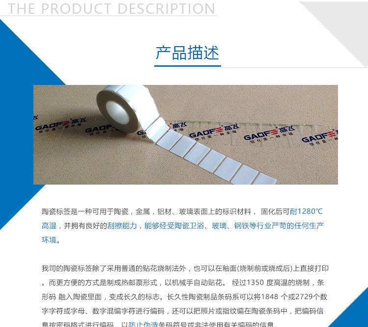 陶瓷標(biāo)簽可以用于金屬,陶瓷,玻璃產(chǎn)品的識(shí)別和條碼管理。固化后標(biāo)簽和打印圖像能夠耐1280℃高溫和優(yōu)異的耐摩擦性能。