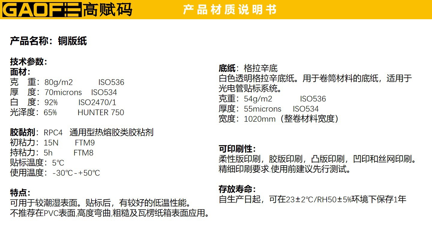 印刷及加工: 經(jīng)超級砑光處理的半高光表面,非常適合用于各種印刷工藝進行單色及彩色印刷。