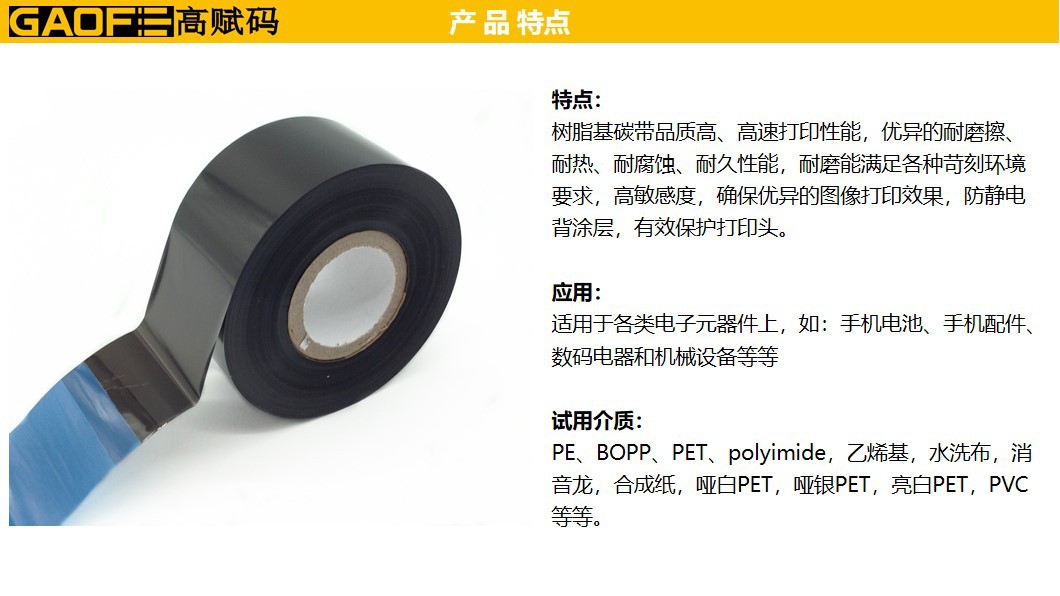 樹脂基碳帶品質(zhì)高、高速打印性能,優(yōu)異的耐磨擦、耐熱、耐腐蝕、耐久性能,耐磨能滿足各種苛刻環(huán)境要求,高敏感度,確保優(yōu)異的圖像打印效果,防靜電背涂層,有效保護(hù)打印頭。