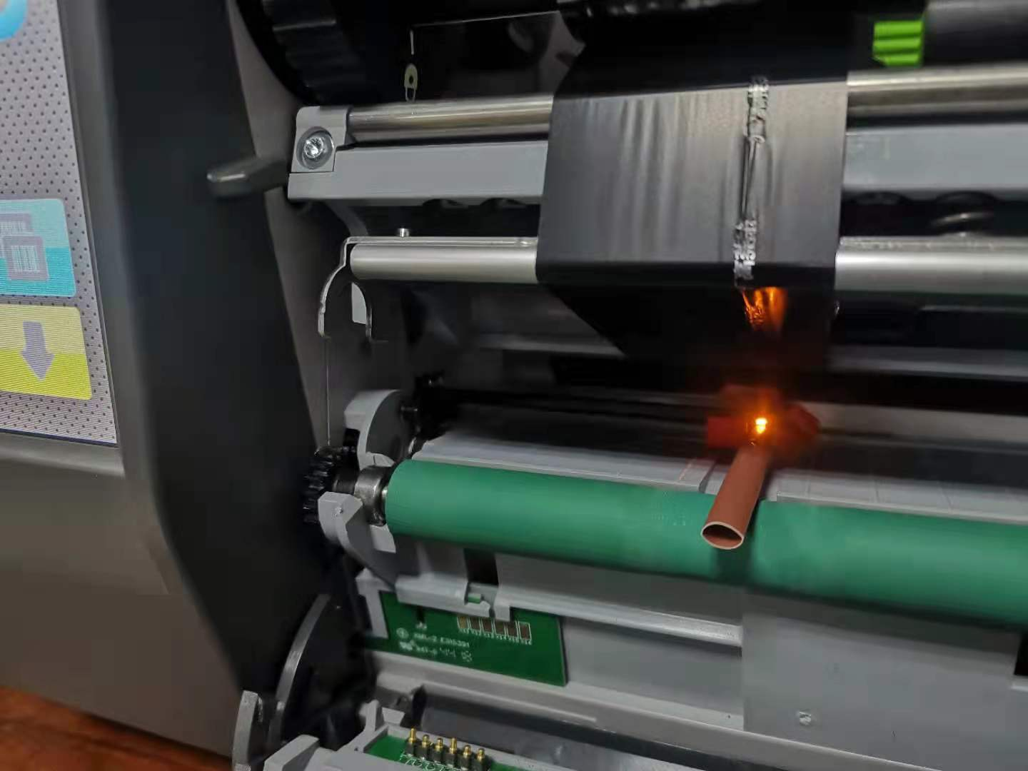 技術員:增加壓力就能打印清晰了,麻煩取下切刀,抬起打印頭,然后拍照打印機正面圖。
